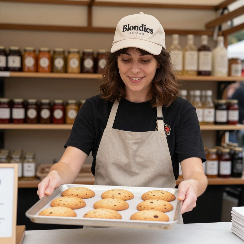 Smiling brunette woman wearing a beige Blondies Kitchen baseball cap and apron stands behind a counter, presenting a tray of freshly baked golden-brown cookies at a pop-up kiosk in London market, with shelves of jars and bottles visible in the background.