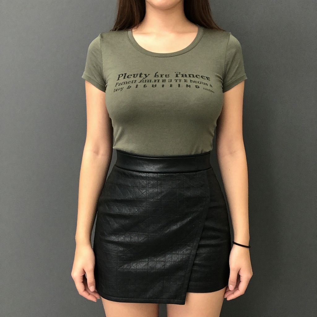 "Woman, casual chic, olive green fitted T-shirt with text print, short sleeves, crew neckline, paired with a black faux leather mini skirt, asymmetrical wrap style, textured with quilted pattern, fitted silhouette, minimal accessories with a black slim wristband, natural makeup, loose hair.. Sexy. Pretty face and beаutiful eyes. Big breasts."