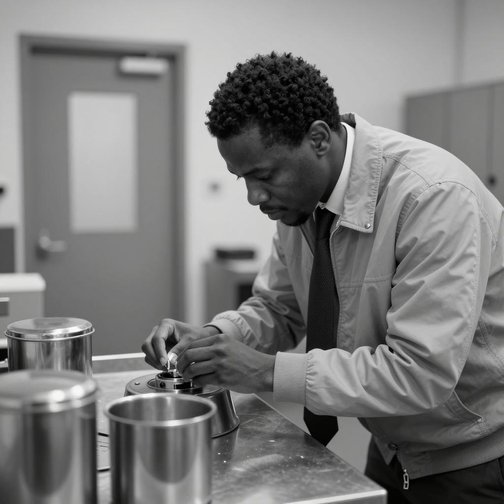 Black and white photograph of a Black man with short, curly hair, wearing a light-colored jacket with a dark tie. He is leaning forward, hands on a metal counter, looking intently at a circular metal device. Three metal containers are on the counter. Background includes a door and vertical paneling.