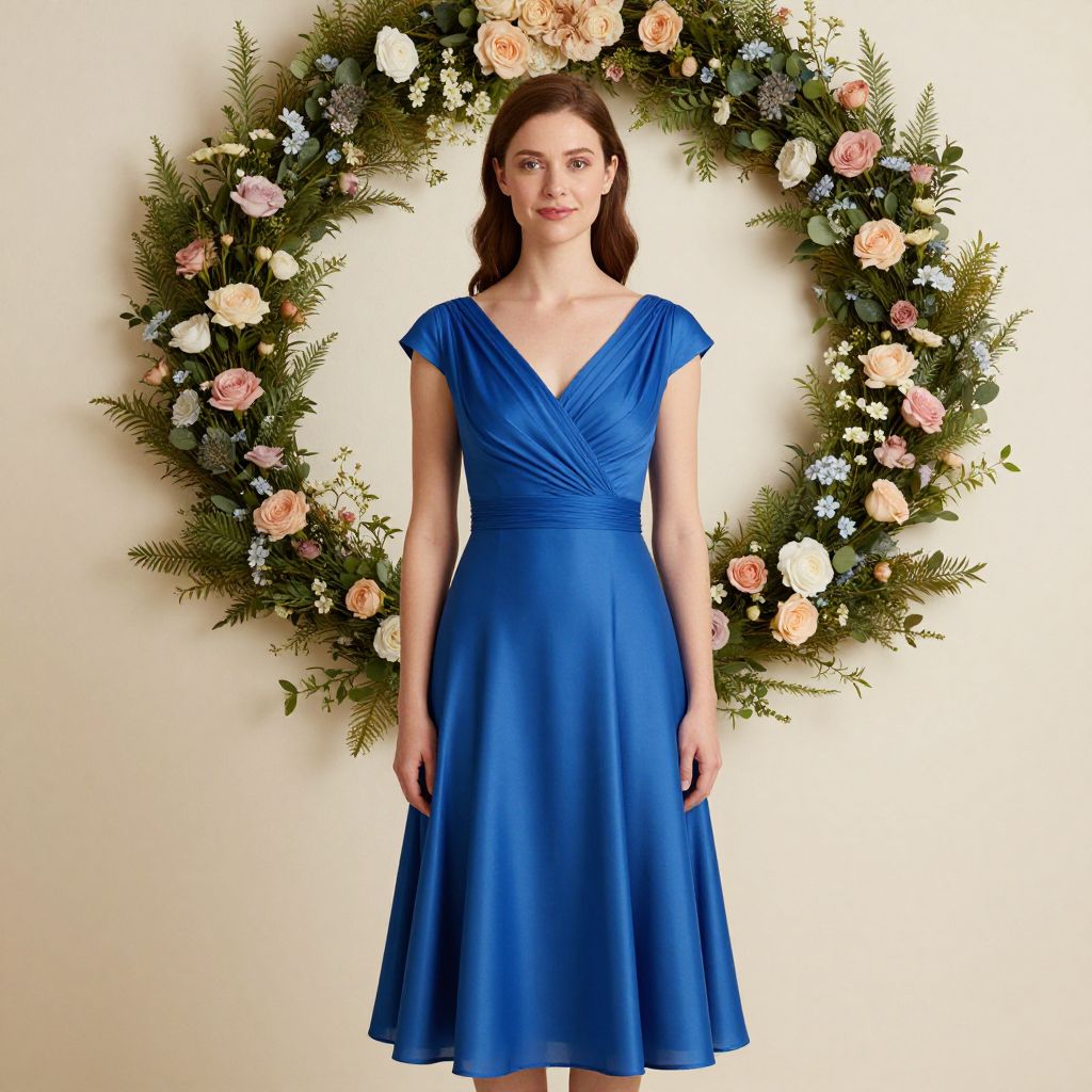 Photograph of a fair-skinned woman with brown hair, wearing a royal blue, short-sleeved, V-neck, knee-length dress, standing