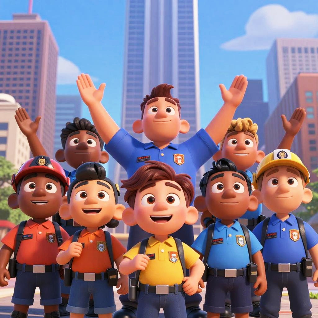 Pixar-style animated scene depicting a heartfelt tribute to 9/11 heroes, with vibrant colors and expressive characters showing unity and hope in a city skyline backdrop.