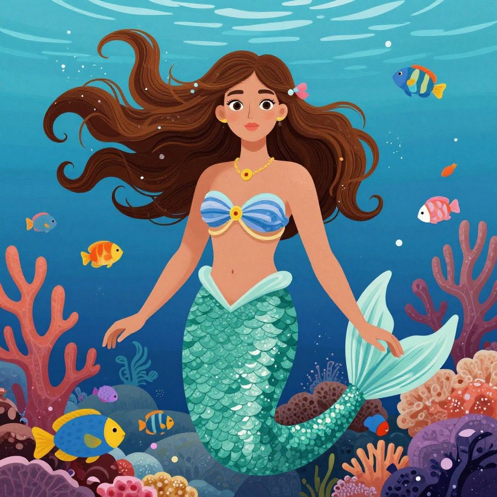 This vibrant artwork features a young woman depicted as a mermaid amidst a lively underwater scene. The intricate details of her flowing hair and elegant attire are complemented by colorful fish and lush coral, creating an enchanting marine environment. The illustration showcases a bold and whimsical style, emphasizing the harmony between human beauty and the sea.