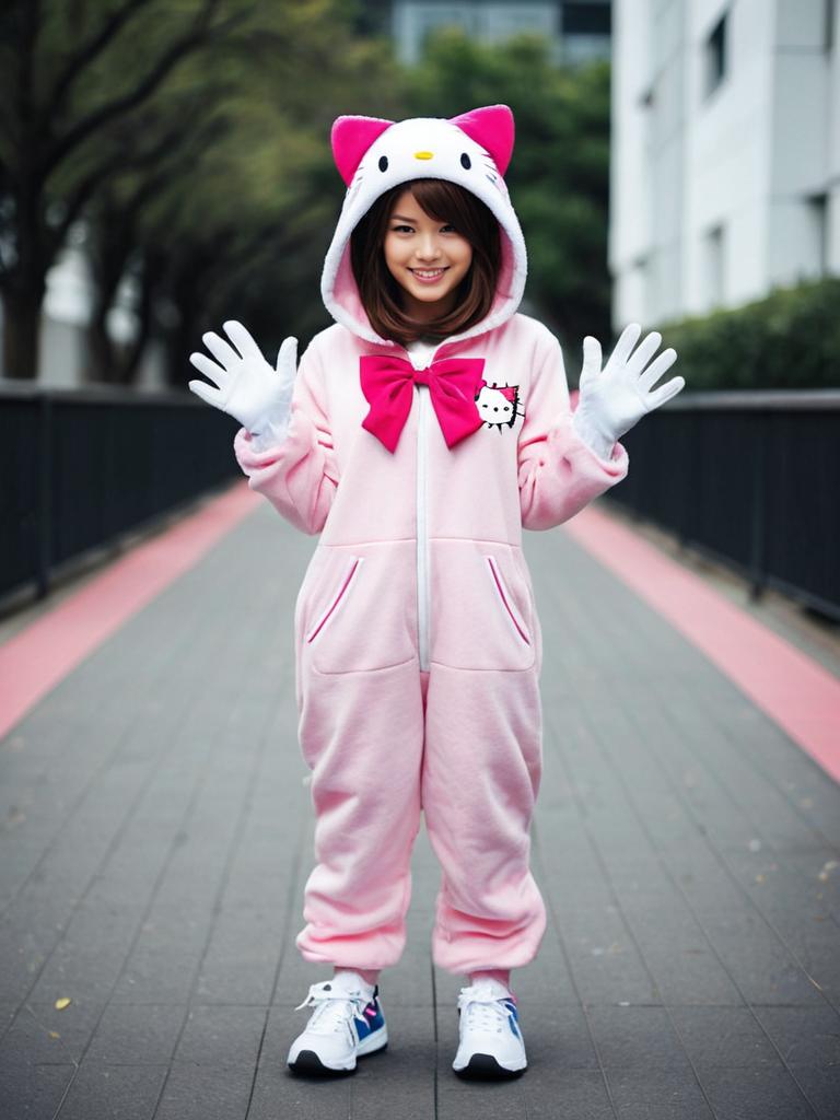 Hello kitty character, 1girl, gloves, brown hair, cosplay, blurry background, kigurumi, bow, pink bow, looking at viewer, blurry, full body, smile, white gloves, solo focus, hood, shoes, realistic, solo, sneakers, standing, short hair
