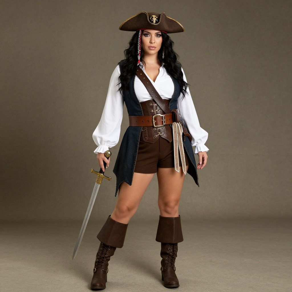 Roving Buccaneer Costume Plus Size Woman, pirate woman in a brown hat and vest with a sword