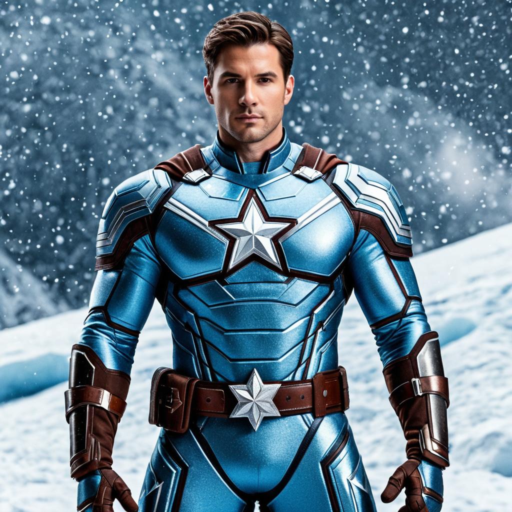 A muscular man with short brown hair and a serious expression wearing a futuristic icy blue and silver superhero suit. The suit features a prominent star emblem on the chest, brown gloves, and a matching brown belt with a silver buckle. The background shows a snowy winter scene with falling snow, emphasizing a cold, icy theme. The detailed sci-fi armor has intricate patterns, presented in a front medium shot with cinematic quality.