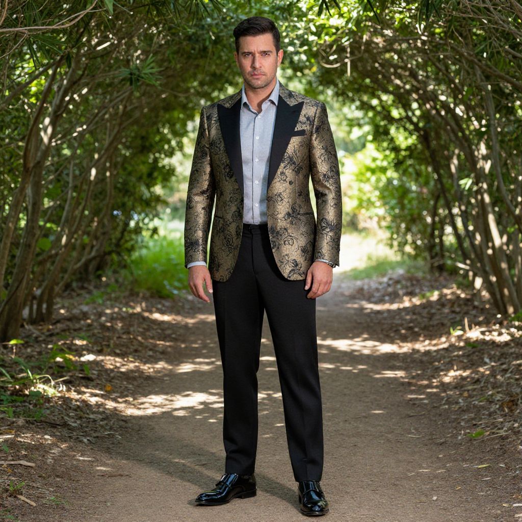 A man, floral jacquard dinner jacket in gold and black, light gray dress shirt, tailored black chinos, shiny black monk strap shoes, lush green canopy, winding dirt path, dappled sunlight filtering through leaves, camera obscura, confident expression. Man has masculine face and piercing eyes