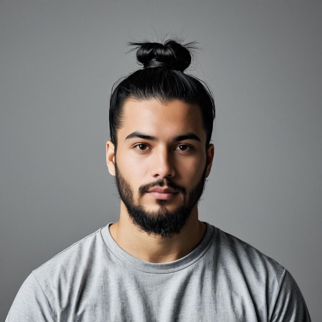 Portrait of a young man with black hair styled in a half bun topknot, sporting a full beard and mustache. He is wearing a plain grey t-shirt and looking directly at the camera against a simple grey background. The image captures his upper body in a realistic style.