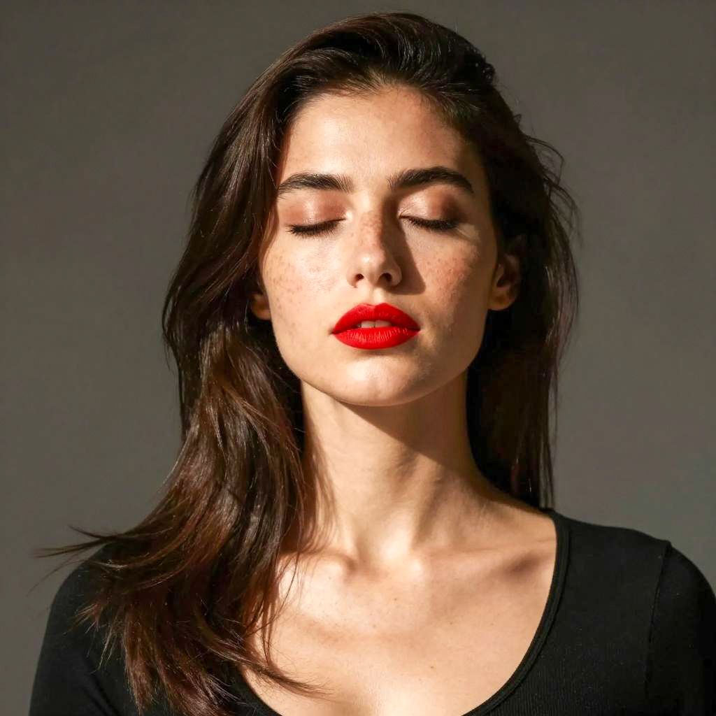 Photograph of a woman with fair skin, dark brown wavy hair, and red lipstick. Sunlight highlights her face, casting shadows on her right side. She has closed eyes and slightly parted lips. She wears a black top with a deep neckline. Dark background with light beams.
