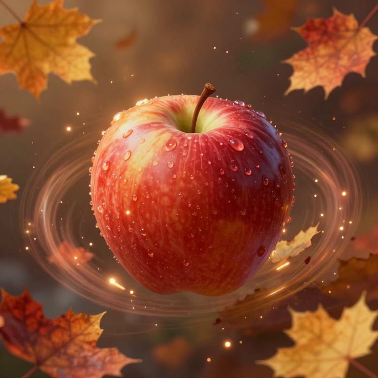 Apple floating in mid-air surrounded by swirling colorful autumn leaves, magical light particles around, surreal fantasy style, rich warm tones, dynamic composition, highly detailed, painterly effect
