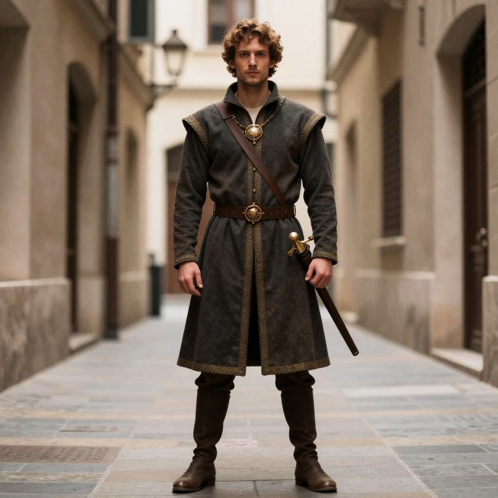 Elite Renaissance Prince Man, man in medieval costume standing in a narrow alleyway