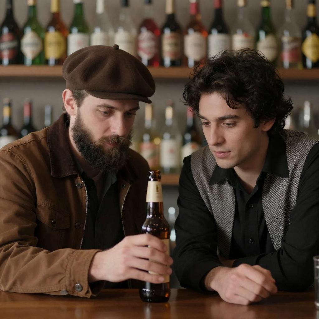 Photograph of two men in a bar. The bearded man on the left wears a brown beret and brown jacket, holding a beer bottle. The man on the right, with dark hair, wears a black shirt with white checkered details, leaning in to examine the bottle. Shelves with colorful bottles are in the blurred background.