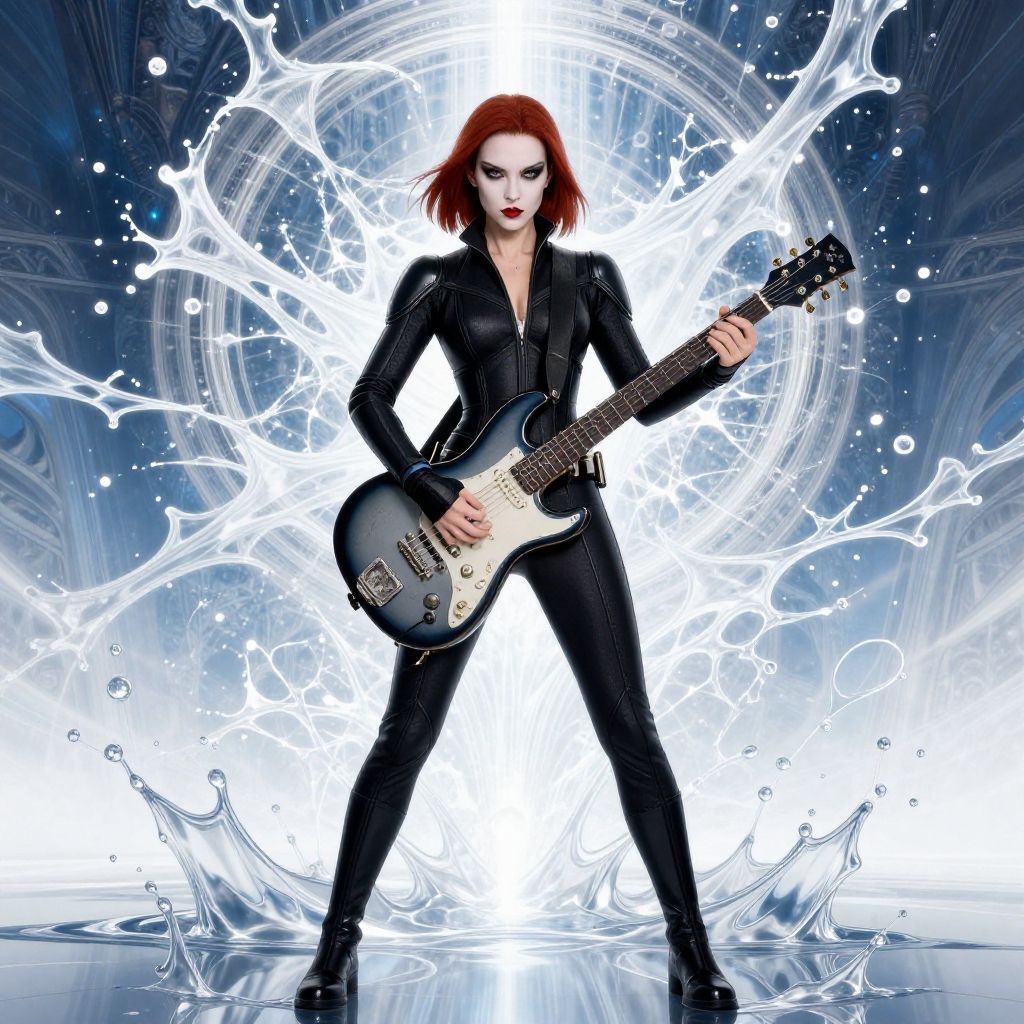 Digital artwork of a fierce, pale-skinned woman with striking red hair, wearing a black, form-fitting leather outfit. She stands confidently, playing a black electric guitar with white accents. Her dark lipstick and intense blue eyes add to her commanding presence. Behind her, a dynamic splash of white and blue energy radiates, resembling a powerful electric shock or water splash. The background is a blend of dark blues and whites, enhancing the dramatic, electrifying effect. The woman's stance is wide-legged, exuding strength and power. The image has a high-contrast, comic-book-like style.