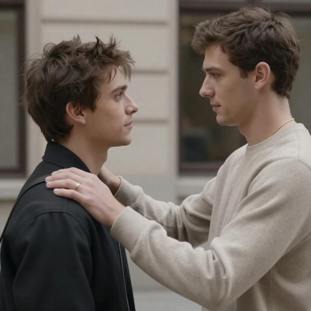 Close-up profile view of two young men standing face to face indoors, with a blurred blackboard in the background. The man on the left is Asian, wearing glasses and a gray shirt. The man on the right is Caucasian, with curly brown hair, wearing a brown jacket over a dark shirt. Both have serious expressions.