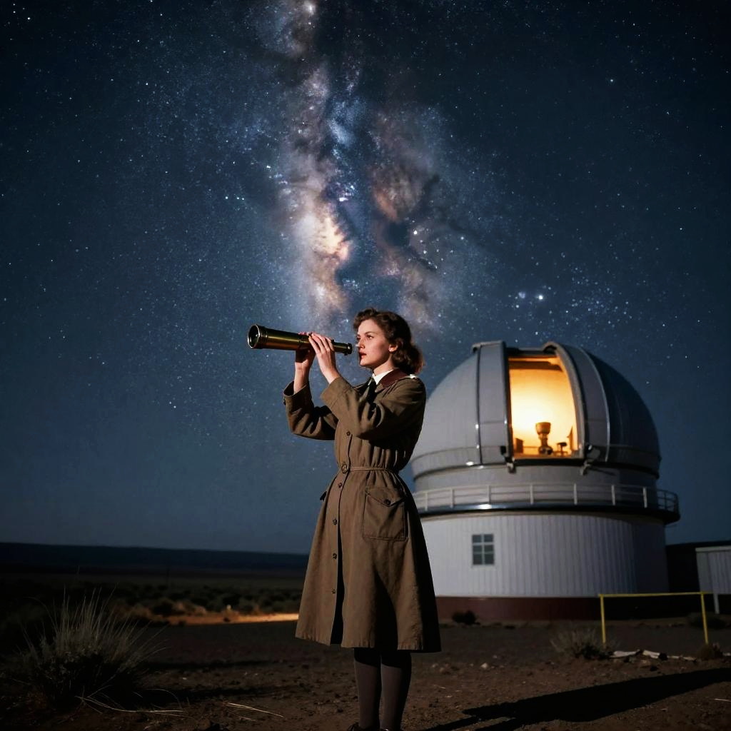 A young woman astronomer in a 1930s expedition coat holding a brass telescope standing in a desert observatory silhouetted against the Milky Way, illuminated by cool starlight with a warm lamp halo from the observatory. The scene evokes a awe-inspiring and solitary mood, reminiscent of classic film styles, featuring rich colors and deep storytelling elements.