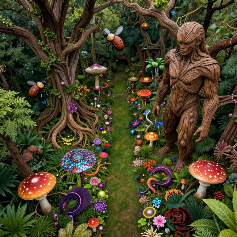 An image captures a surreal landscape where an overgrown garden teems with ancient trees and mythical creatures. From above, viewers witness this fantastical scene, awash in vibrant colors and intricate patterns that evoke both wonder and unease. The flora and fauna intertwine chaotically, with oversized insects flitting between luminous mushrooms and shimmering petals, while a colossal humanoid figure carved from living wood guards this bizarre Eden. This harmonious blend of beauty and terror invites viewers to delve into its mysterious depths and uncover hidden truths within the tangled roots and twisted branches of this surreal world.
