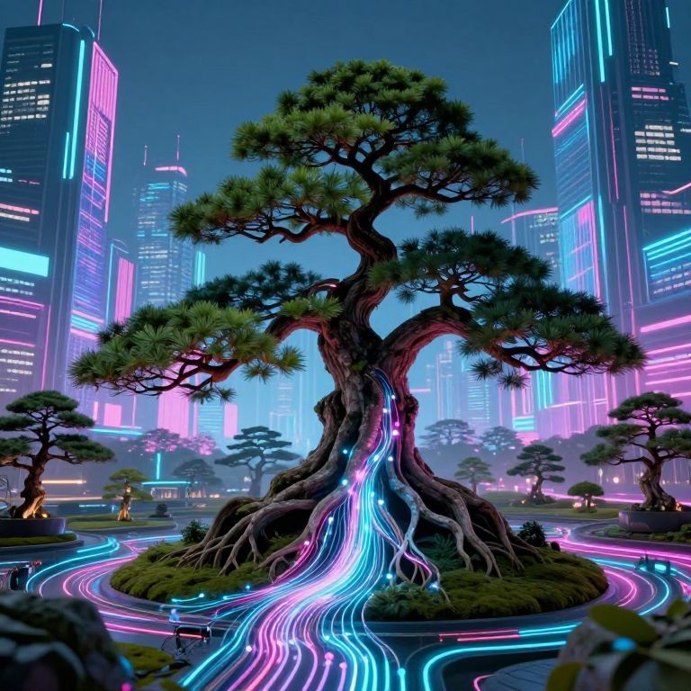 A harmonious fusion of serene Zen gardens and vibrant cyberpunk cities, this imaginative digital artwork portrays an awe-inspiring bonsai tree flourishing amidst a futuristic urban setting. The tree's majestic branches ascend, intertwining with the gleaming structures of holographic skyscrapers that radiate with luminous hues, while its roots delve beneath, entwining with a labyrinthine network of luminescent fiber-optic cables and neon-lit passageways. This captivating scene juxtaposes nature and technology, creating an intriguing atmosphere that stimulates the imagination and blurs the lines between organic and artificial elements.
