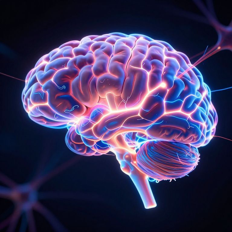 Neon-lit, glowing 3D CGI of a human brain, showcasing vibrant blue, pink, and white lights against a black background.