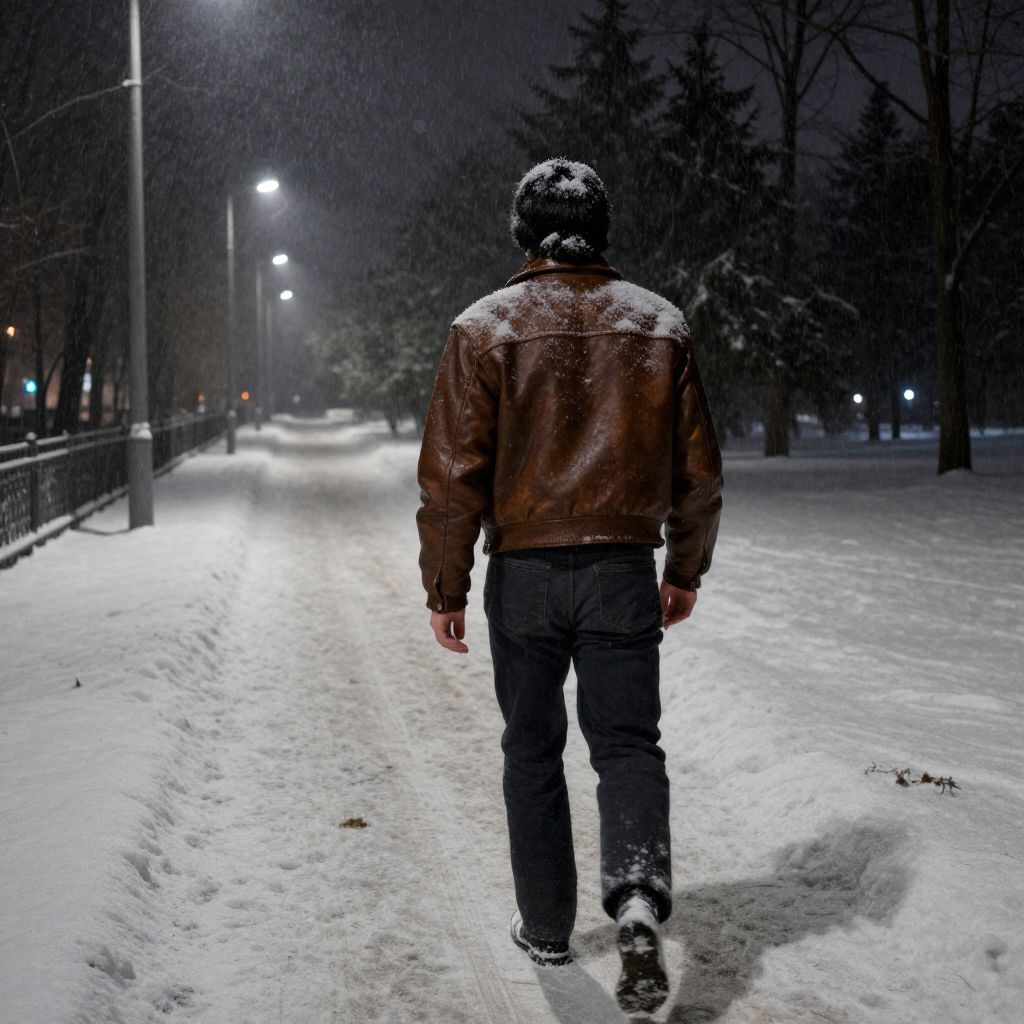 Photo of snow - covered man from back in pacing to empty narrow alley with street lamps in park with pines to the horizon, dressed in short leather jacket, snowfall at night, 1980 s mullet haircut, black hairs, concept art, cinematic, dramatic, painting, digital art, detailed, realistic, igla movie shot, low lighting, 24 mm, deem lights