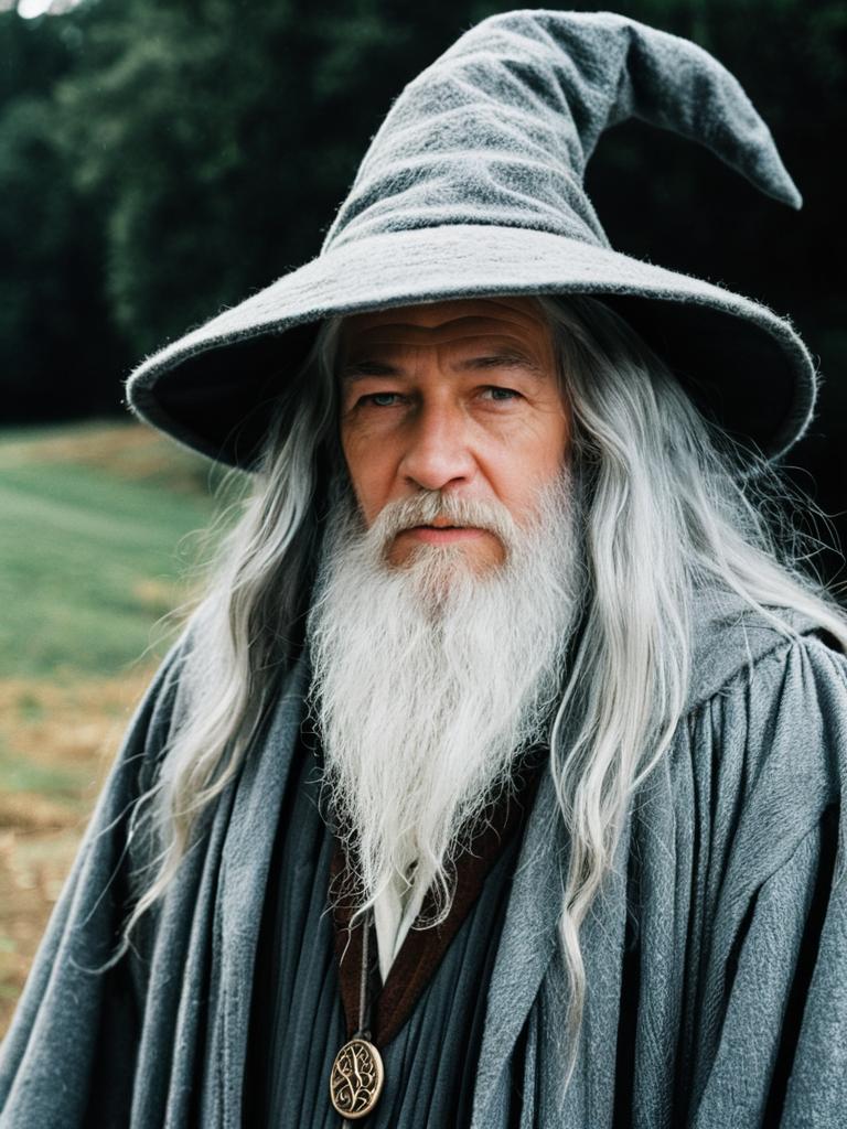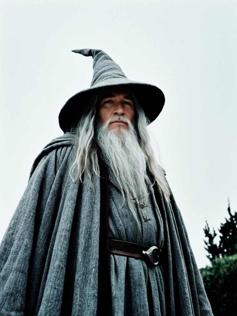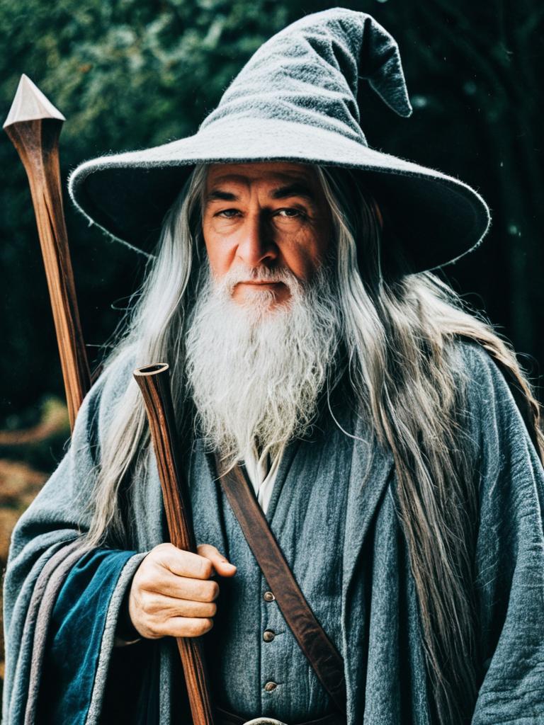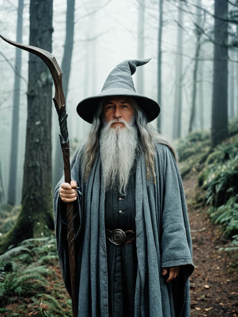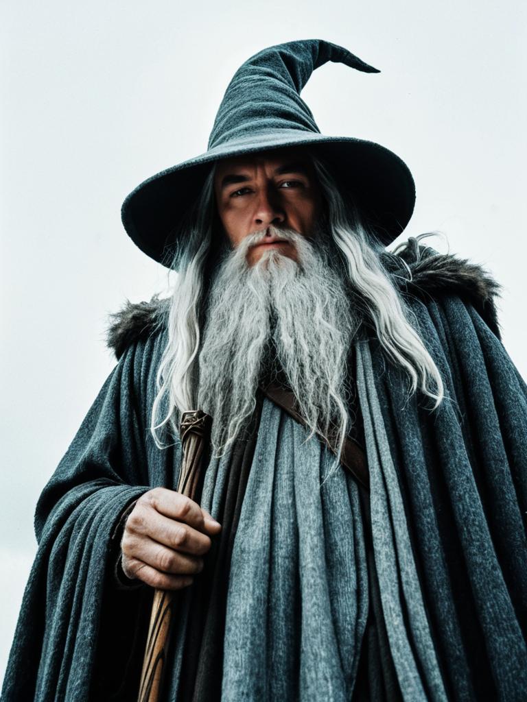Man in Gandalf costume, editorial fantasy cosplay photo, cinematic realism