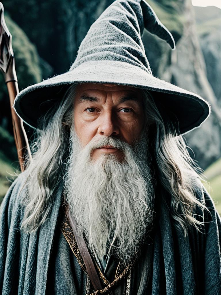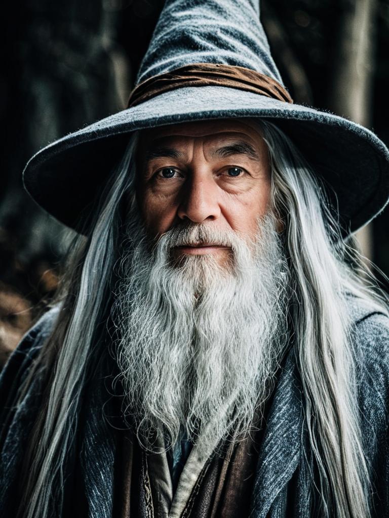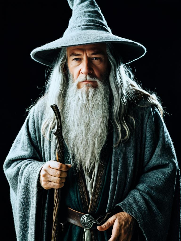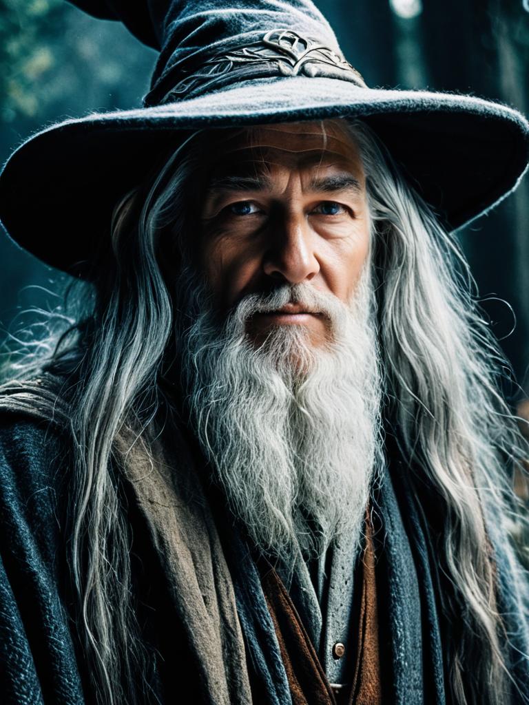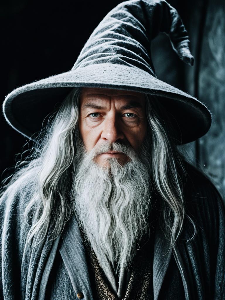Man in Gandalf costume, editorial fantasy cosplay photo, cinematic realism