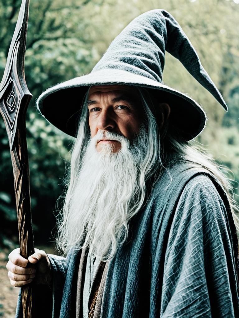 Close-up portrait of a man dressed in a Gandalf-inspired fantasy cosplay costume, featuring a long white beard, gray wizard hat, and robe, holding a detailed wooden staff. The background is blurred greenery, enhancing the cinematic and editorial fantasy realism style.