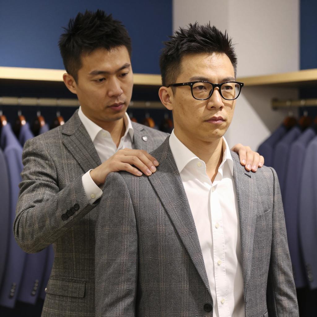 Two Asian men in a clothing store, both wearing gray plaid and herringbone suit jackets with white shirts. The man in front wears black glasses and looks serious, while the man behind adjusts the shoulder of the jacket. Background features a clothing rack with blue jackets and a blue wall.