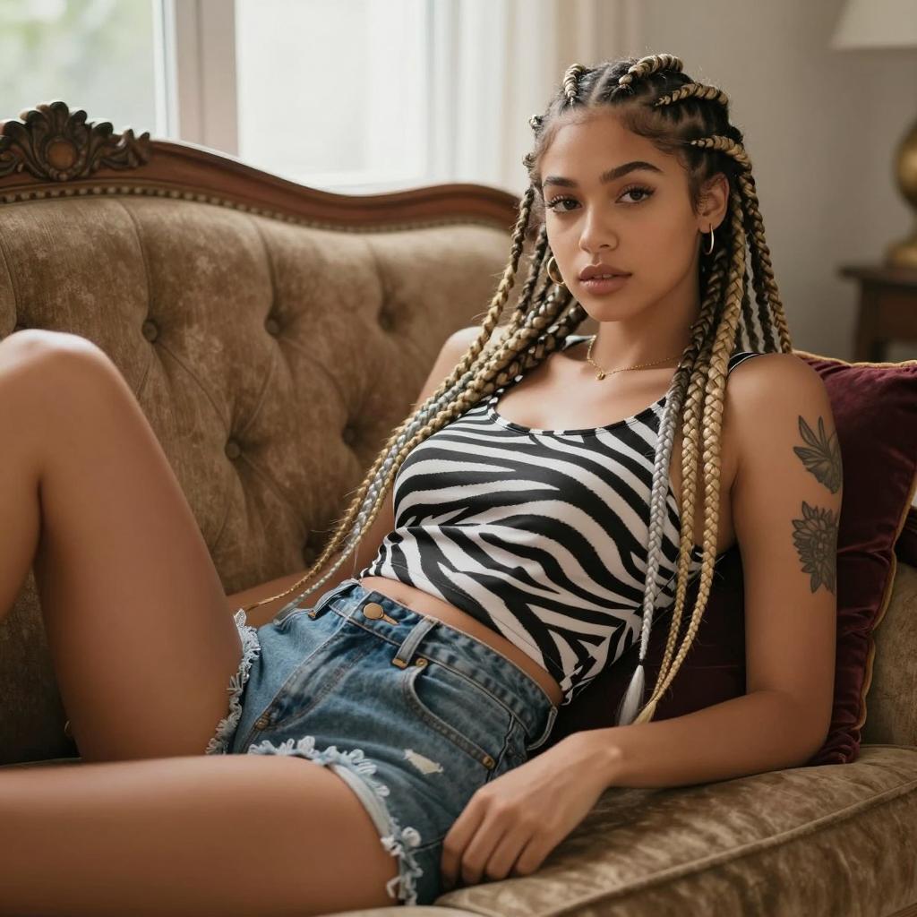1girl, woman, wearing ultra-short bandeau crop top and high-waisted relaxed-fit ripped jeans in black bandeau top with dark indigo jeans on woman with long braided hair and subtle bronze makeup posed perched on a stair step, elbows resting on her thighs, relaxed smile in balcony scene overlooking a hazy city skyline under mixed sun and shade with dappled patterns on the ground, laid-back summer lifestyle fashion photography, high resolution, ultra-detailed