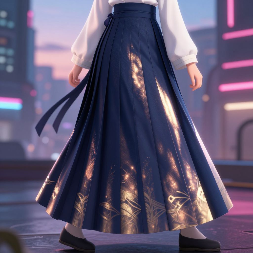 Anime long skirt with elegant pleats, blending traditional and modern styles, a character walking through a futuristic cityscape at dusk, neon lights reflecting off the fabric, subtle wind effects enhancing skirt texture, highly detailed environment and clothing