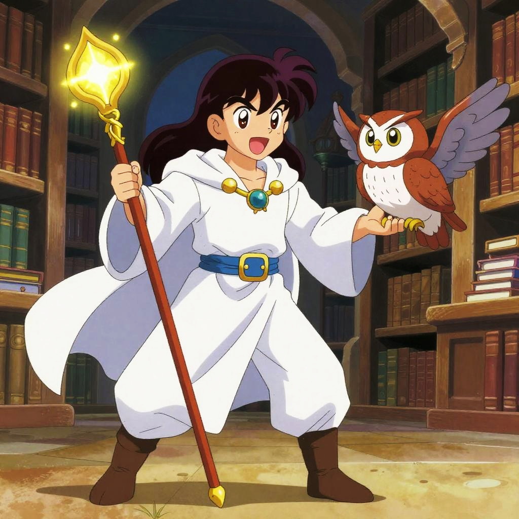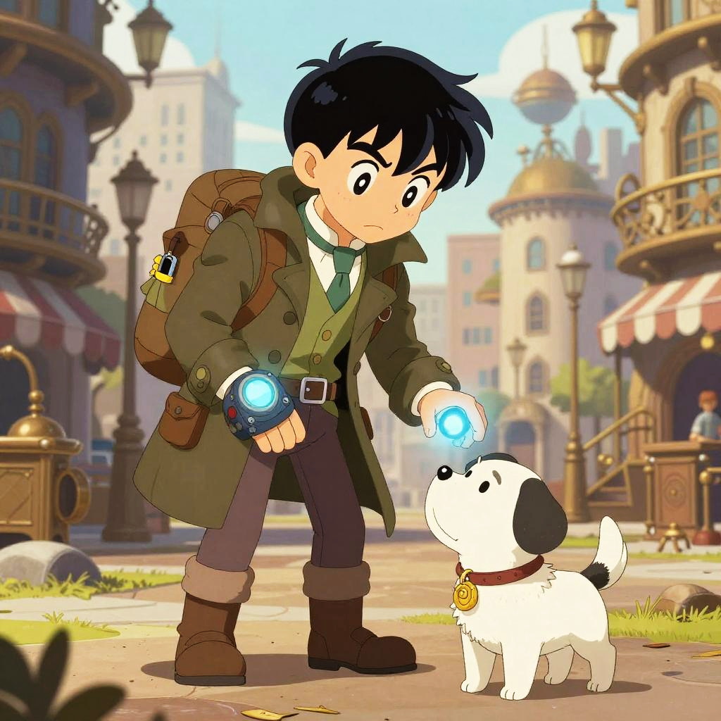 Steampunk inventor, with goggles, leather apron, and mechanical arm, interacting with brass clockwork bird, set in vintage workshop filled with gears, illustrated in Akira Toriyama's playful and detailed style.