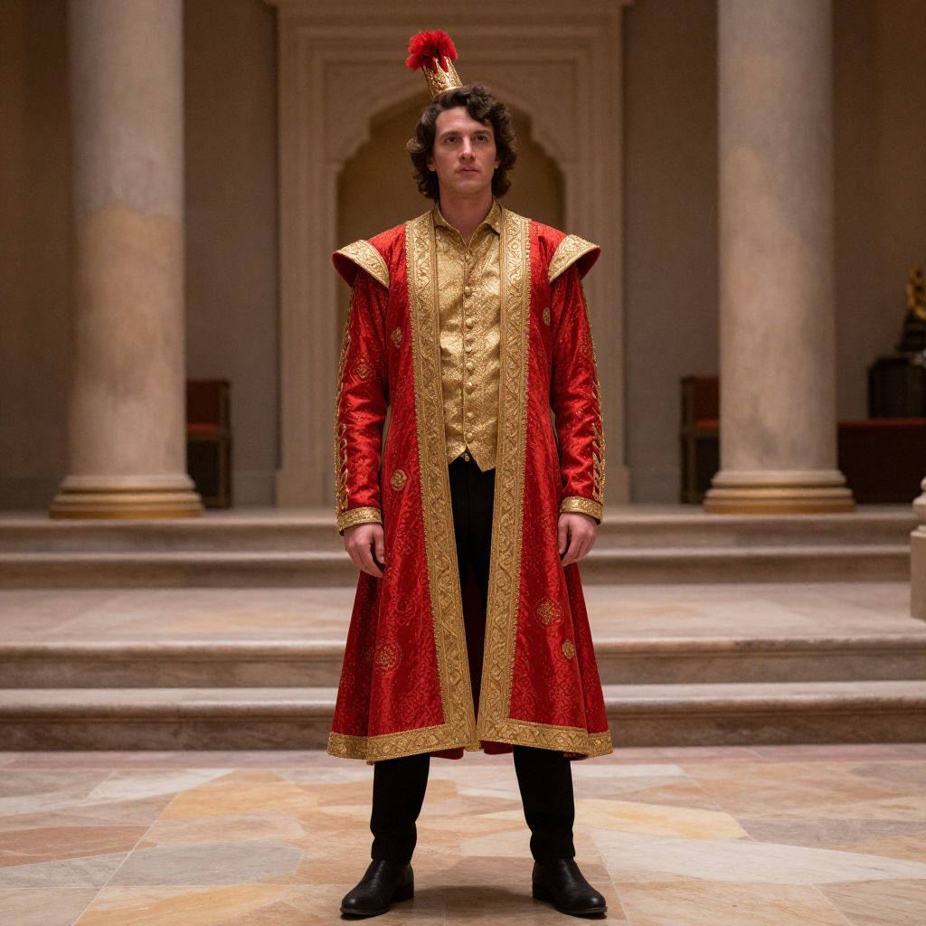 Photograph of a young man with curly brown hair, standing in an ornate, classical-style room with tall columns and a marble floor. He is wearing a long, red and gold embroidered coat with a high collar and a red feathered hat. The coat's gold embroidery is intricate, featuring floral patterns. He pairs the coat with black pants and black shoes. The background includes a large, arched doorway with detailed stone carvings. The lighting is soft, highlighting the rich colors and textures of his regal attire.