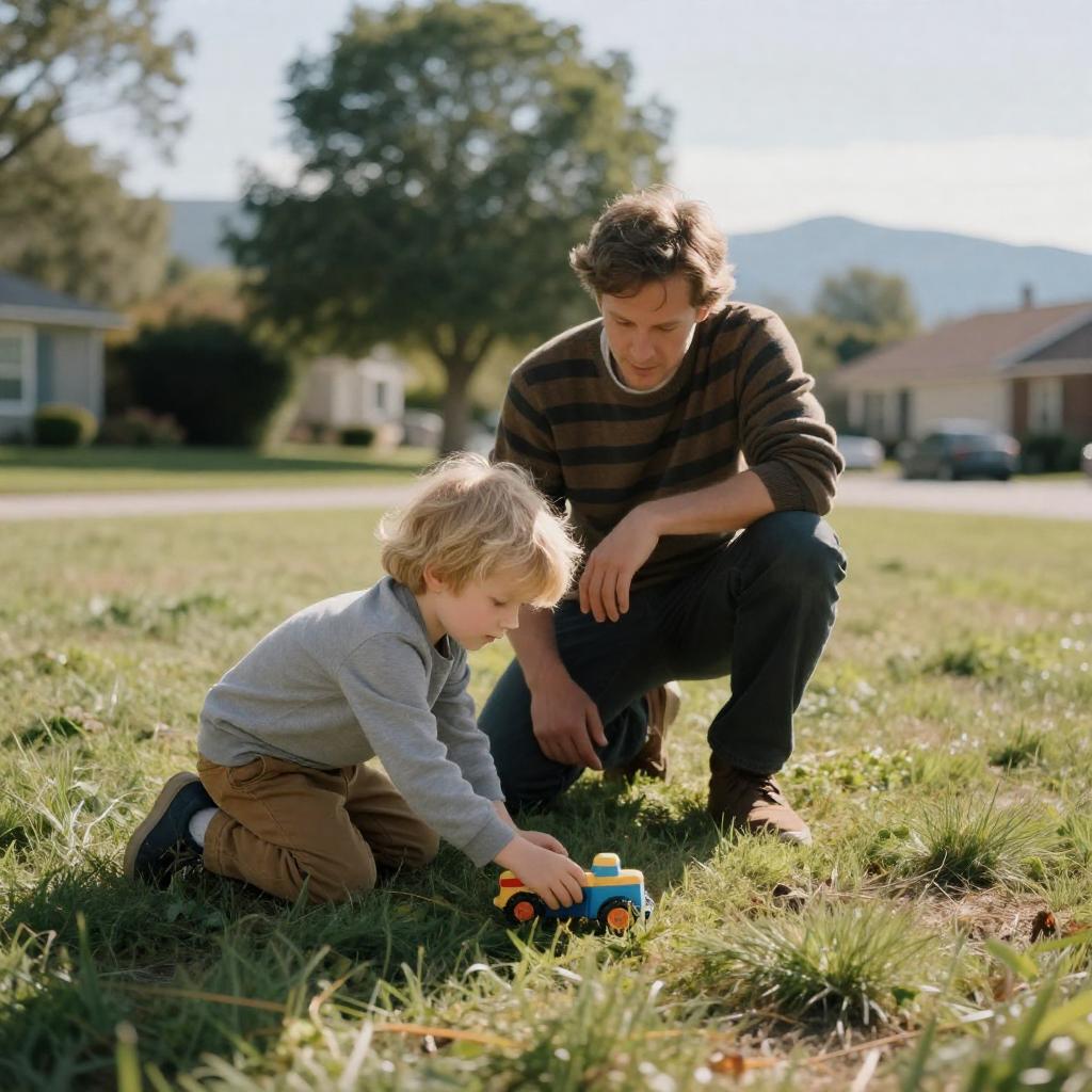 Photograph of four people in a cozy, sunlit porch. A man with a guitar leans back, playing. A woman with blonde hair and a patterned dress sits next to a boy in a navy shirt. Another boy in a blue cap sits at a cluttered wooden table with snacks and magazines. Greenery visible outside. Casual, relaxed atmosphere.