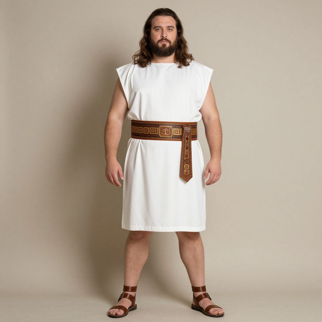 A plus-size man stands confidently against a plain wall wearing a white Greek-inspired toga dress with a wide brown belt and leather sandals. His long brown hair and beard complement the mythological style, evoking a modern interpretation of ancient Greek fashion.
