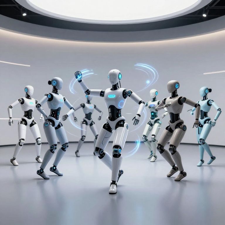 AI dance robots in a sleek modern studio, diverse robotic forms synchronized in a complex dance routine, holographic effects highlighting movement trails, soft ambient lighting creating a serene yet high-tech mood, ultramodern minimalistic background