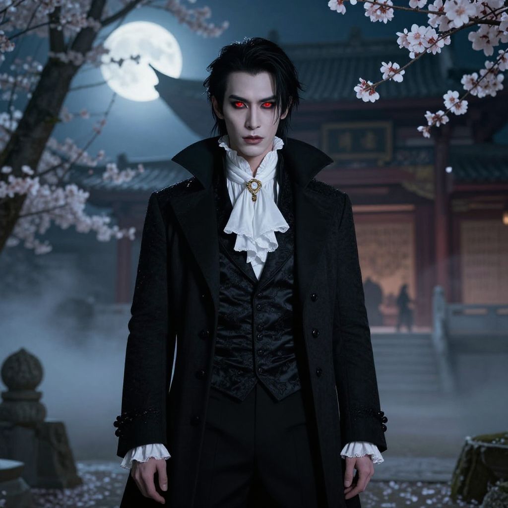 Asian vampire man with pale skin and glowing red eyes, dressed in elegant Victorian attire, standing in a moonlit ancient temple surrounded by mist and cherry blossoms.