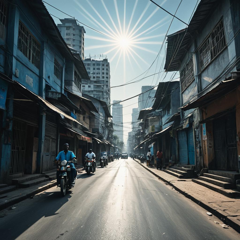 Retro Fashion Accessories A dry, cracked riverbed with only a trickle of water running through it, surrounded by parched trees and brown, barren land. In the distance, a city skyline can be seen, a stark reminder of the increasing demand for water in urban areas,