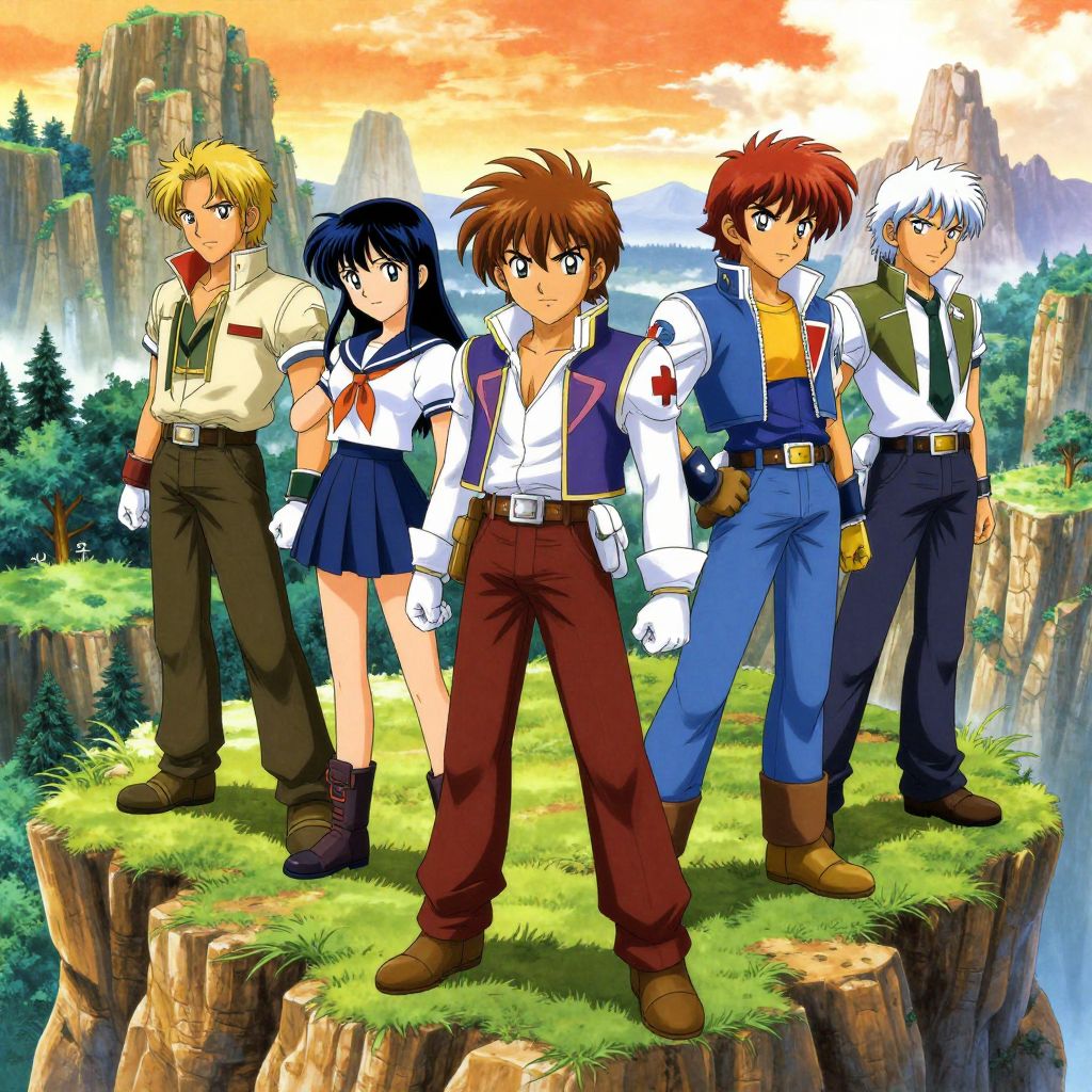 Anime-style illustration of five adventurers standing on a grassy cliff, each wearing different outfits, with a colorful sunset and mountains in the background.