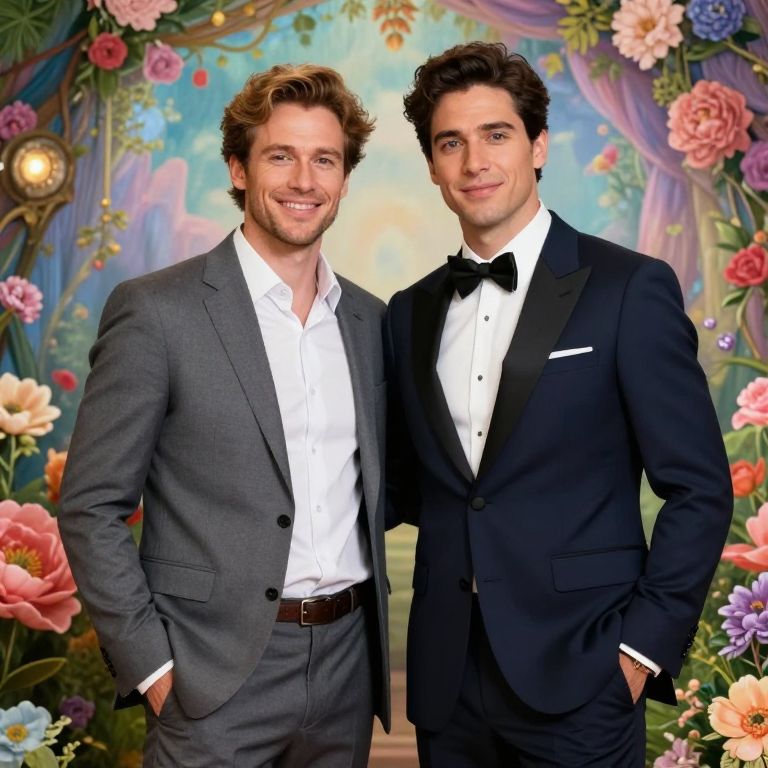 Two well-dressed individuals stand close together in a vibrant, romantic setting, with intricate details and a dreamy atmosphere reminiscent of James Jean, Ashley Wood, and Edgar Maxence's art styles.