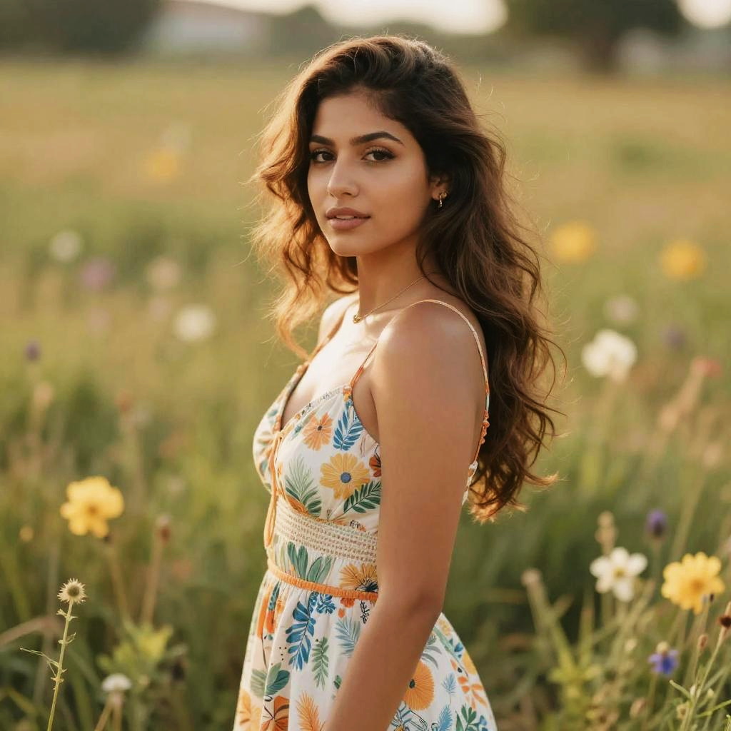 Latina sister smiling warmly in a sunlit urban park, wearing colorful casual clothes, vibrant flowers around, joyful and lively atmosphere, detailed portrait style