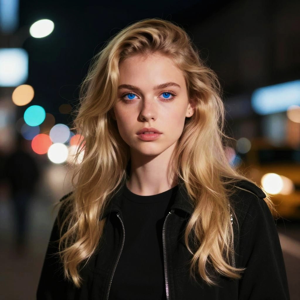 Blonde woman with blue eyes, wearing a white crop top and blue denim jacket, stands confidently in a busy urban street. Photograph.
