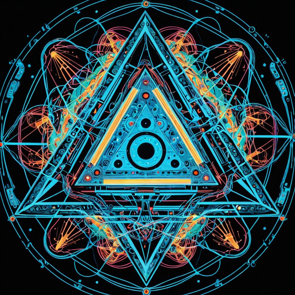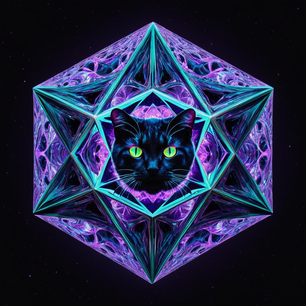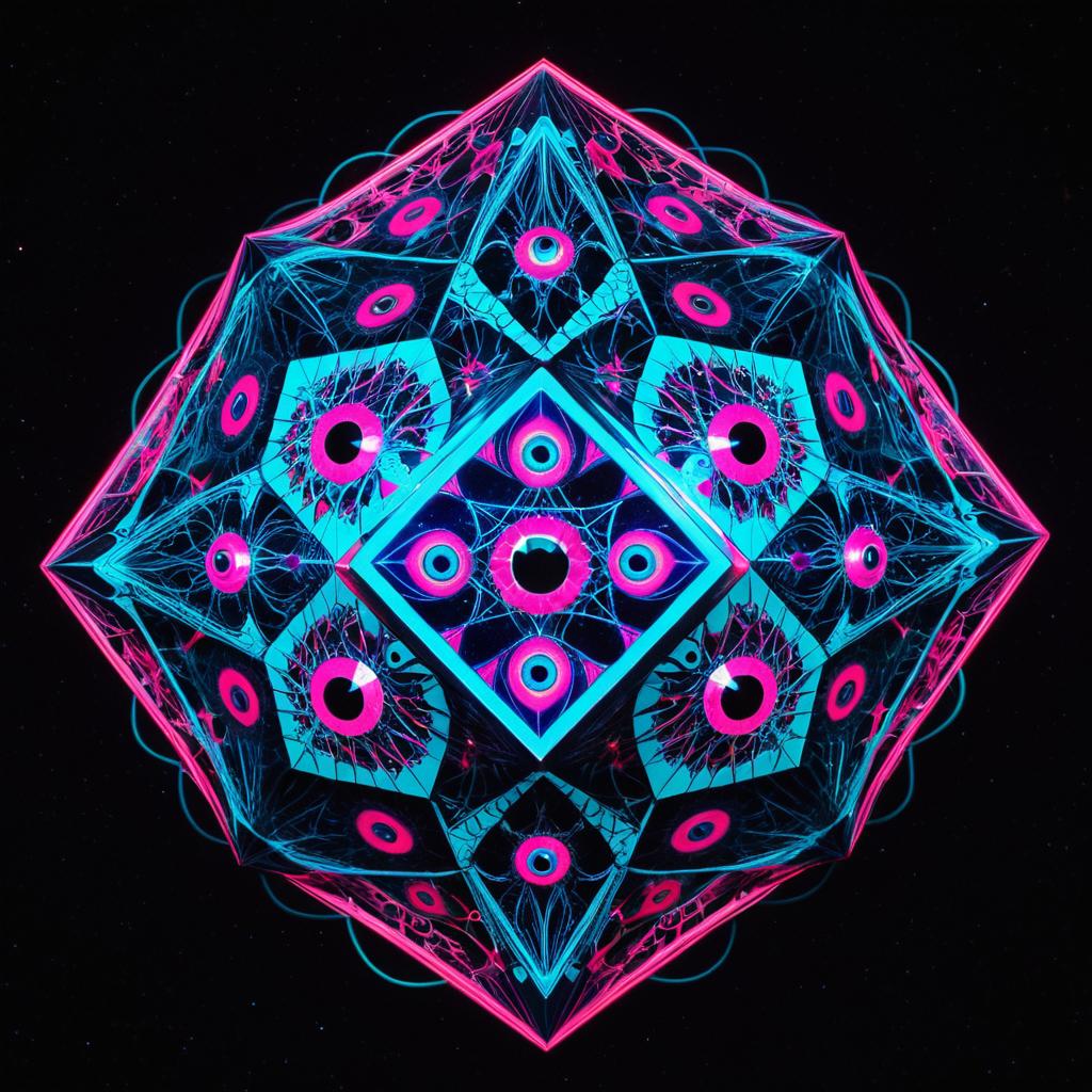 Translucent multidimensional geometric shape churning through extra dimensions:octahedron covered in eyes:multiple bioluminescent eyes pattern combining biological and mechanical elements:bio-metallic plating with tendril-like organic cables with pops of brilliant psychedelic colors:vivid swirling neon pinks and electric blues etheric and otherworldly appearance:glowing aura with fractal patterns