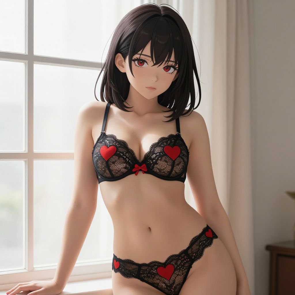 This digital artwork features a confident woman in detailed black lace lingerie with red heart accents, posed elegantly by a sunlit window. The art style is a polished and vibrant anime-inspired illustration, highlighting soft shading and expressive facial features.