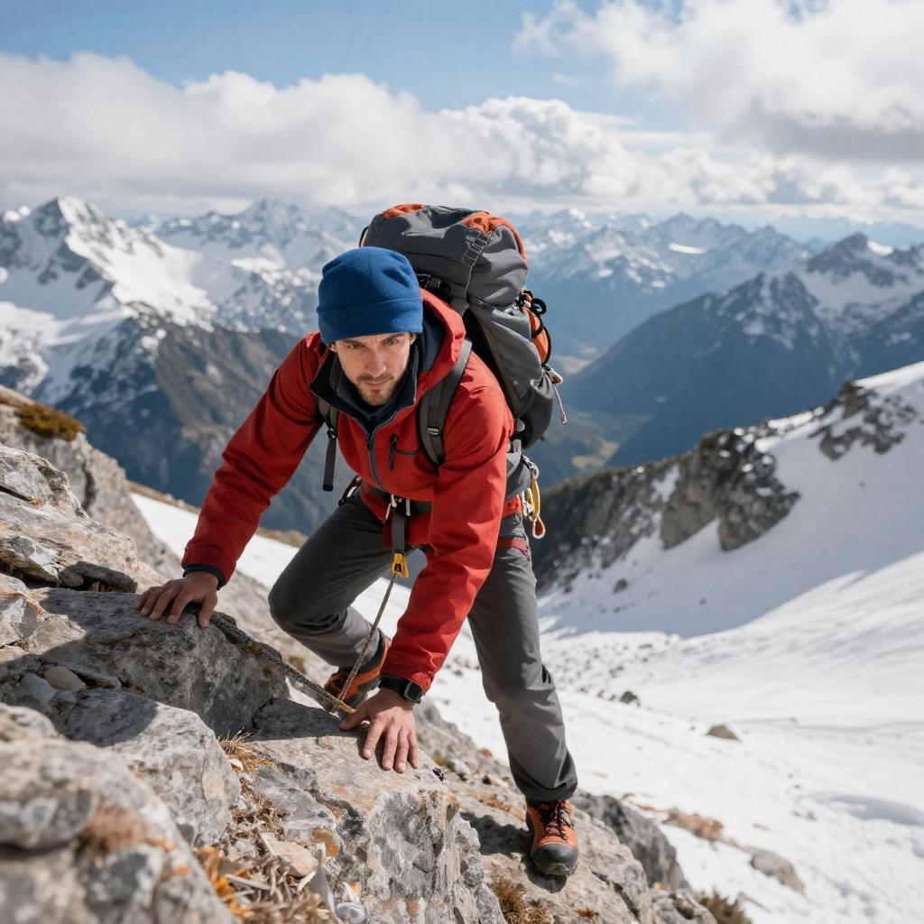 Old man with white hair, red shirt, black beret, and backpack, clinging to rock, holding rifle, intense expression, mountainous background with clouds and snow. Snow-covered peaks in the distance. Climbing, rugged terrain.