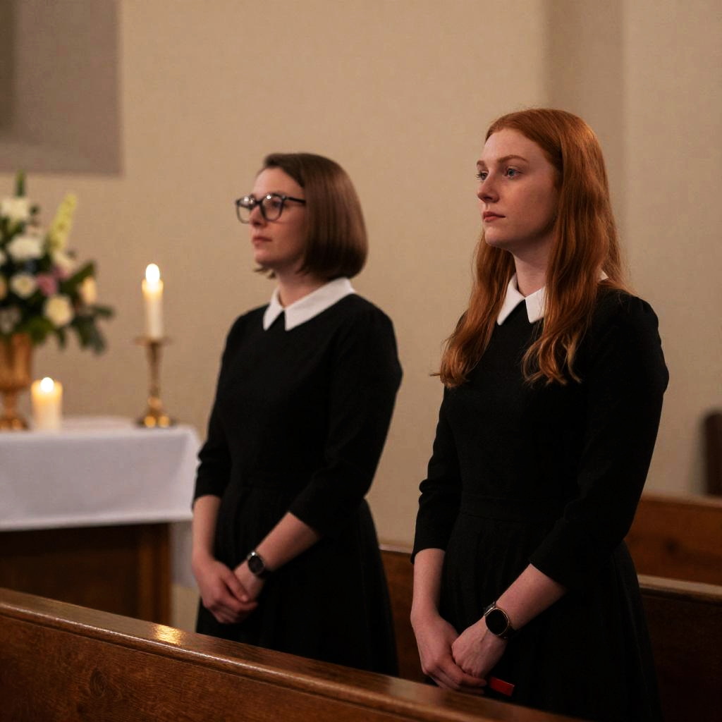 Two women standing inside a church wearing black dresses with white collars. One woman has short brown hair with glasses, and the other has long red hair. They stand solemnly in wooden pews with lit candles and a floral arrangement visible in the background. The atmosphere is calm and warm with dim lighting.