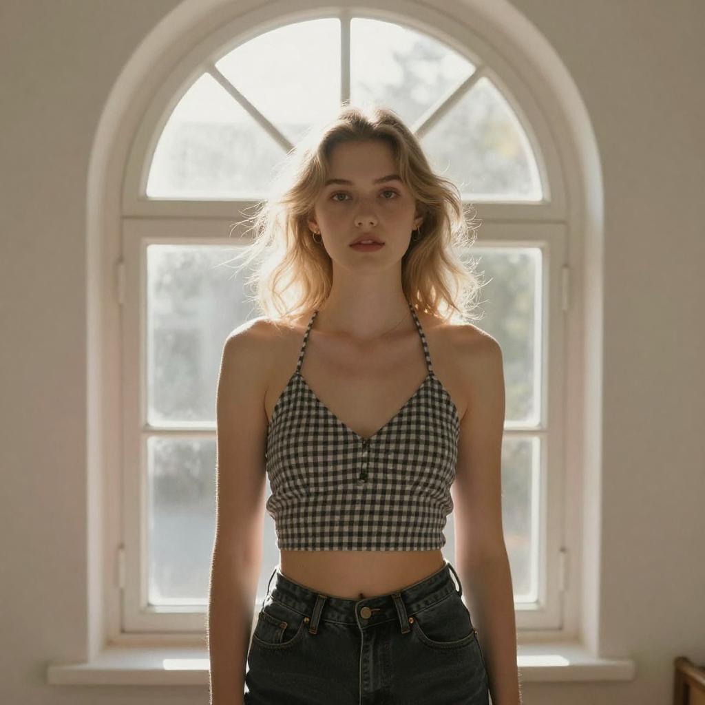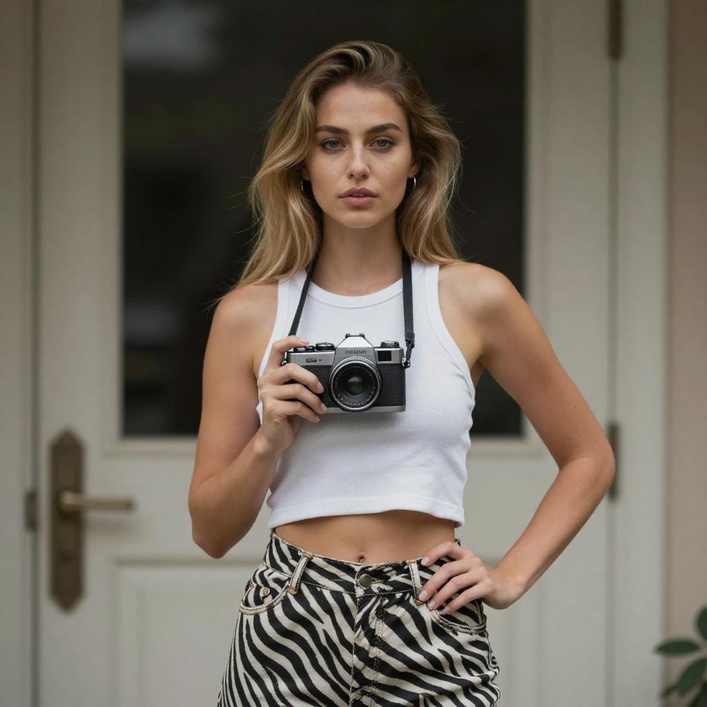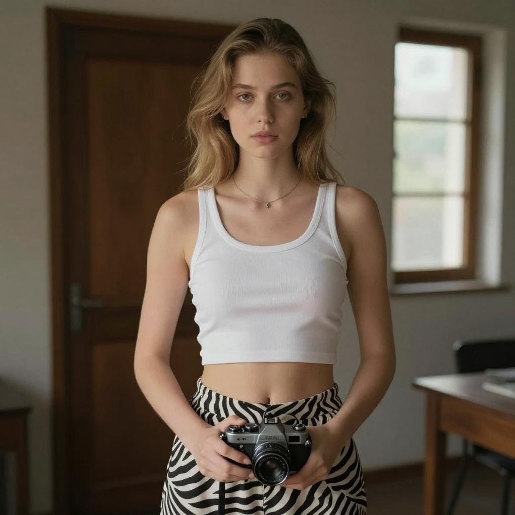Photograph of a young woman with long blonde hair, wearing a white cropped tank top and zebra-patterned pants. She holds a vintage camera in front of her, standing in a dimly lit room with a wooden door and window in the background. Her expression is neutral, and she has a slender build with a visible midriff.