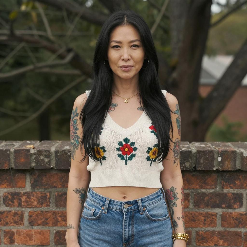 Photograph of a smiling Asian woman with long black hair, red lipstick, and large hoop earrings. She wears a black top, showcasing colorful tattoos on her arms and chest. A black bow adorns her hair. She holds her hands up, displaying rings. The background features blurred greenery and palm trees.