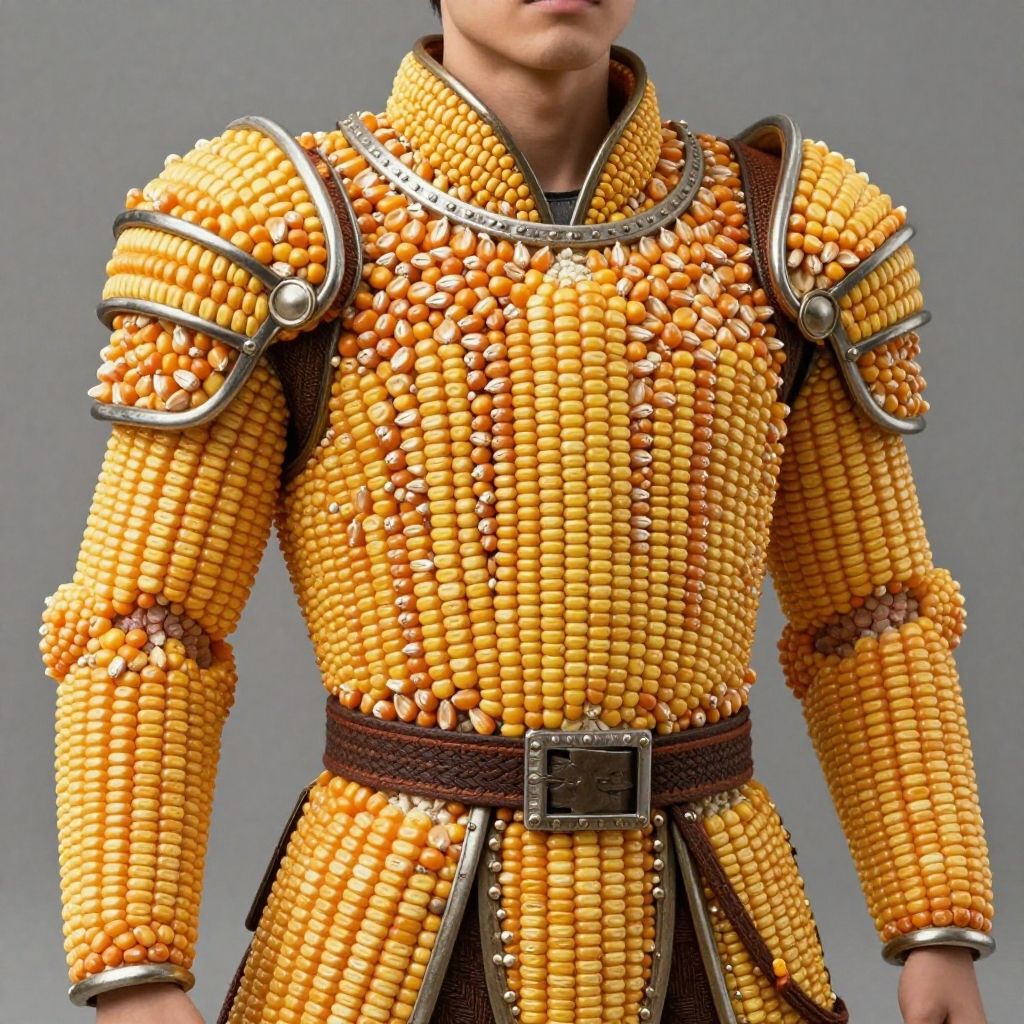 UHQ, 4K, Highly Detailed, Realistic, Photograph, of attractive, individual of undetermined gender wearing a suit of armor made of corn kernels, natural corn texture