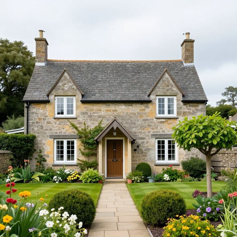 Charming stone cottage with a slate roof and white-trimmed windows stands gracefully amidst lush greenery, featuring a quaint garden with vibrant flowers and a small tree to the right, complemented by neatly trimmed shrubs and a welcoming stone pathway leading to its inviting front door.