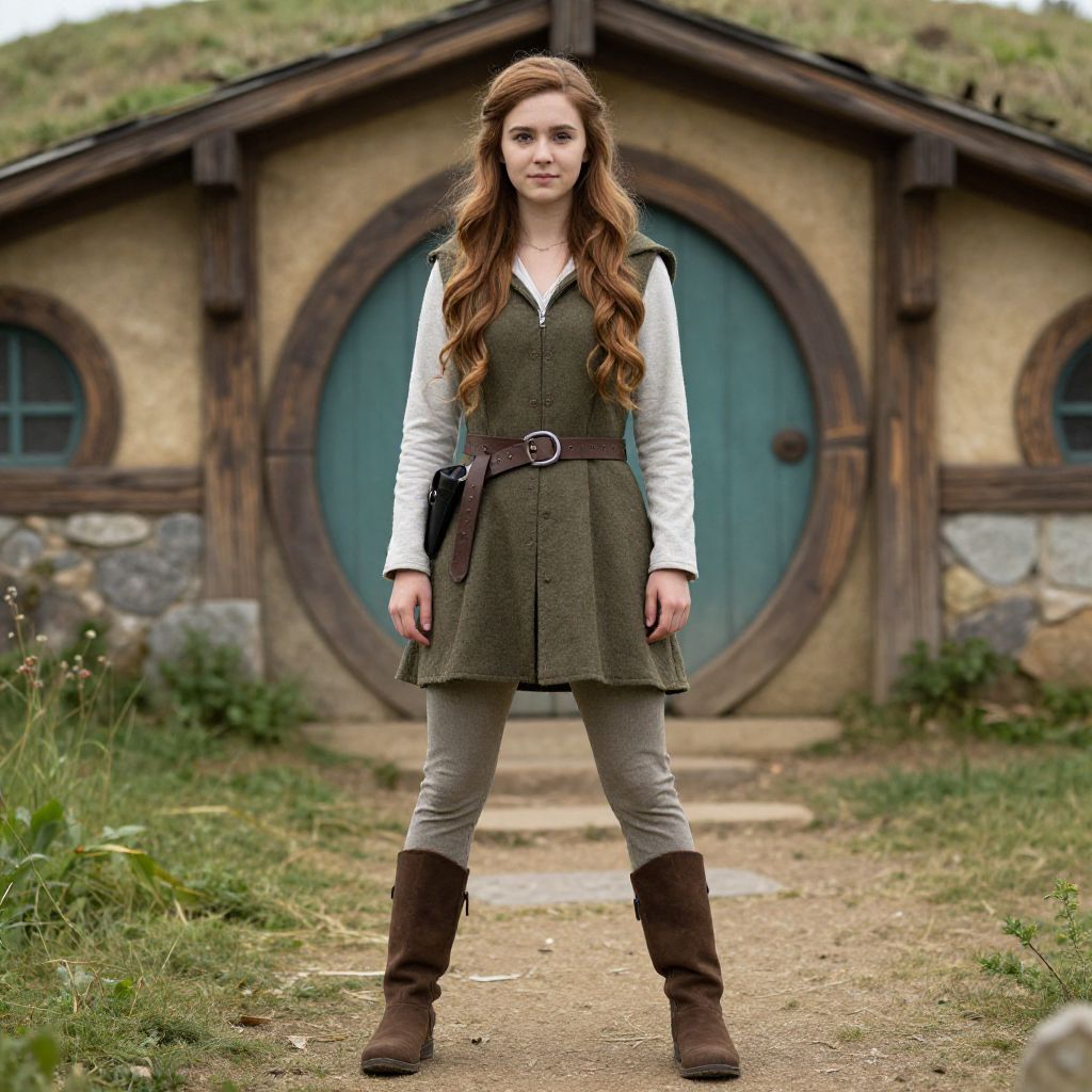 Photograph of a young Caucasian woman with long, wavy brown hair standing confidently in front of a rustic, stone cottage with round, blue doors. She wears a white long-sleeve shirt under a green, belted, sleeveless dress, paired with grey pants and brown knee-high boots. The cottage has wooden beams and stone accents, with grass and wildflowers in the foreground. The woman's expression is serious, and she stands with her hands by her sides on a dirt path leading to the cottage. The image has a fantasy, fairytale-like atmosphere.
