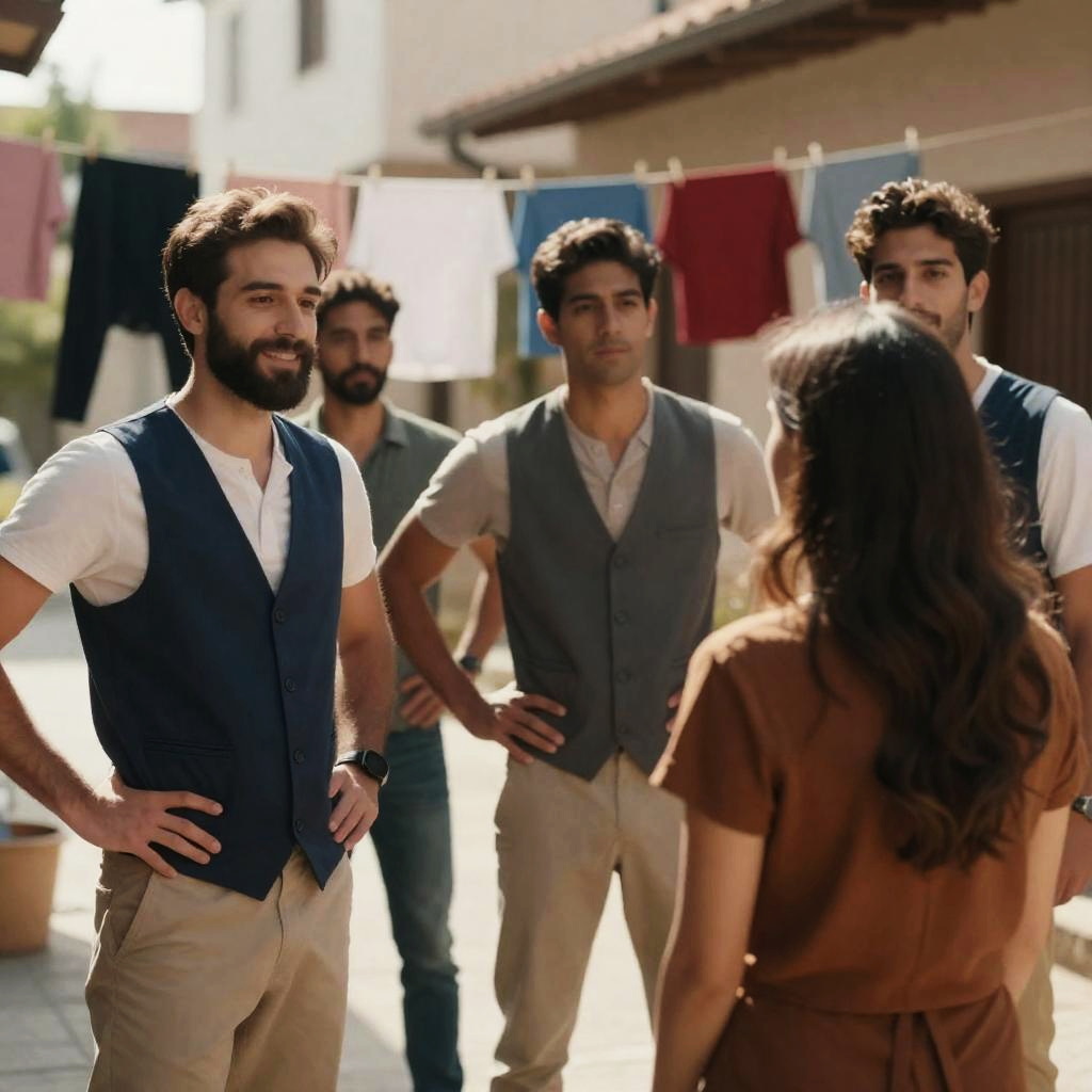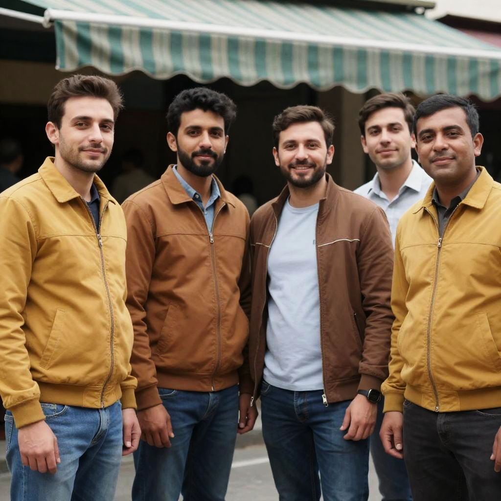 Photograph of four men standing in a street, smiling. Three wear mustard-yellow and brown jackets, one in a light blue shirt. Dark hair, short to medium, casual hairstyles. Green-striped awning, market stall background. Light skin tones, relaxed poses.