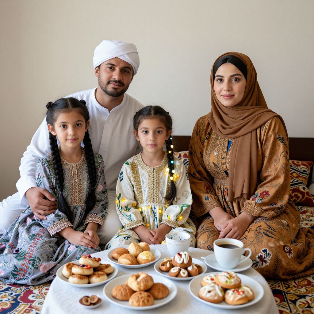 Photograph of a Middle Eastern family of four sitting on a patterned rug. The father, wearing a white thobe and white headscarf, stands behind the mother, who is dressed in a brown embroidered traditional dress and headscarf. Two young girls, one in a gray embroidered dress with braided hair and the other in a white embroidered dress with braided hair, sit in front. They are surrounded by plates of assorted pastries and a white coffee cup. The background is a plain white wall, and the setting appears to be a warmly lit indoor room.